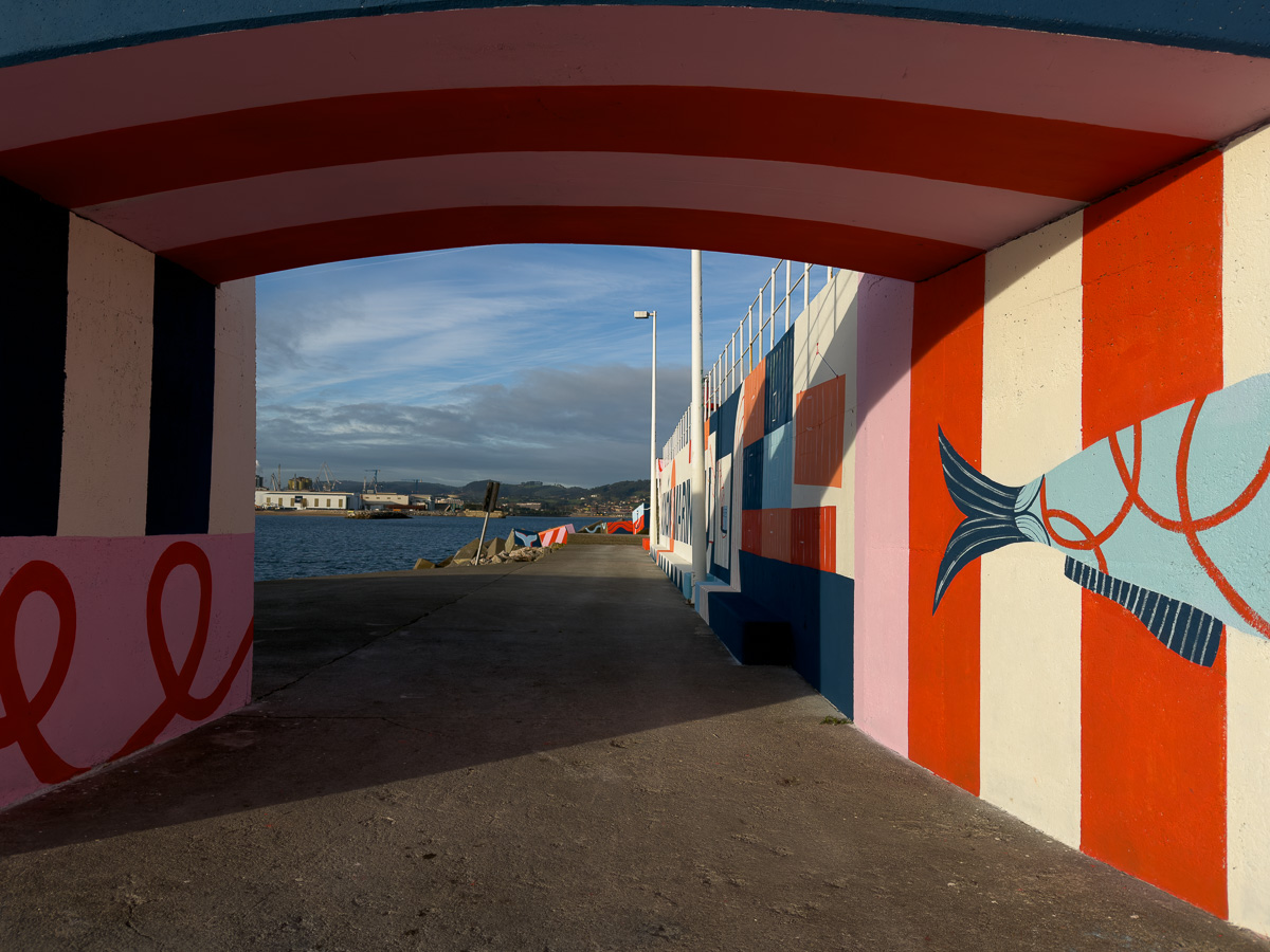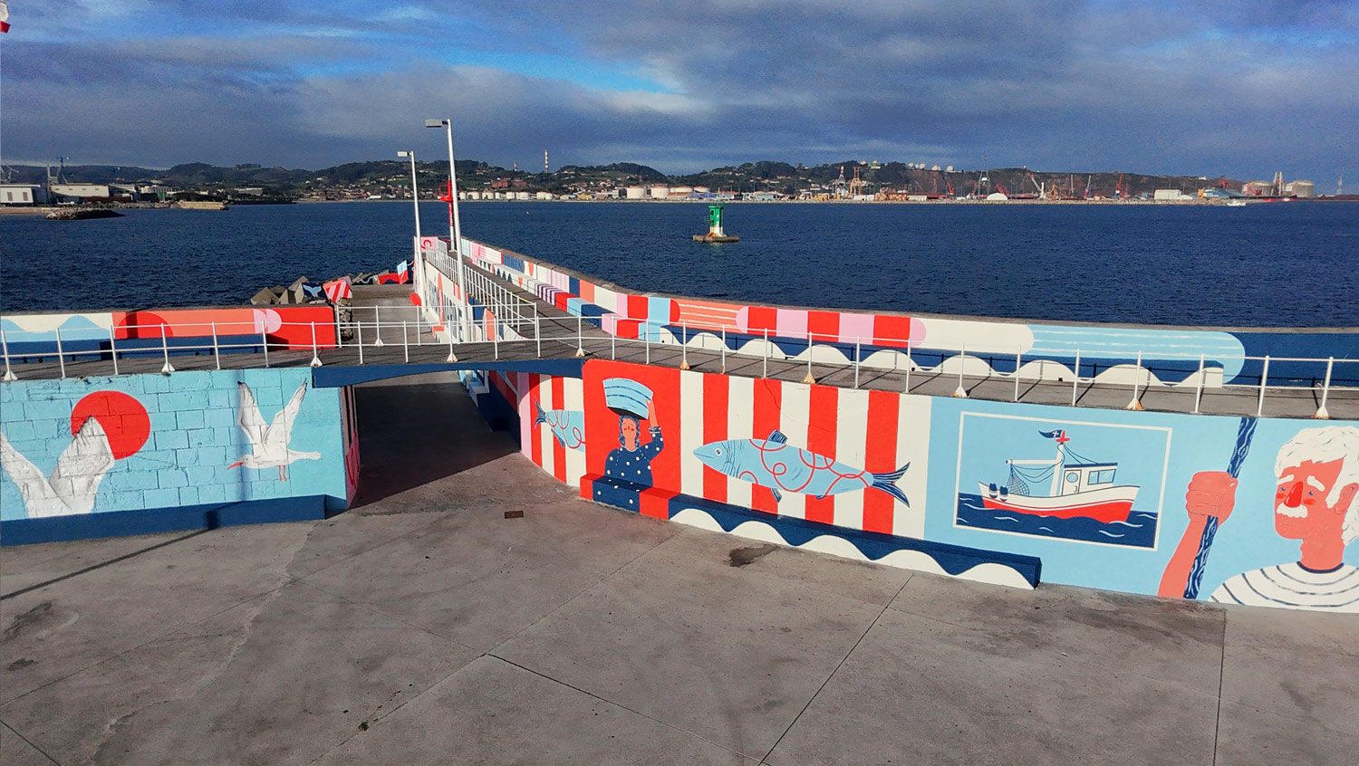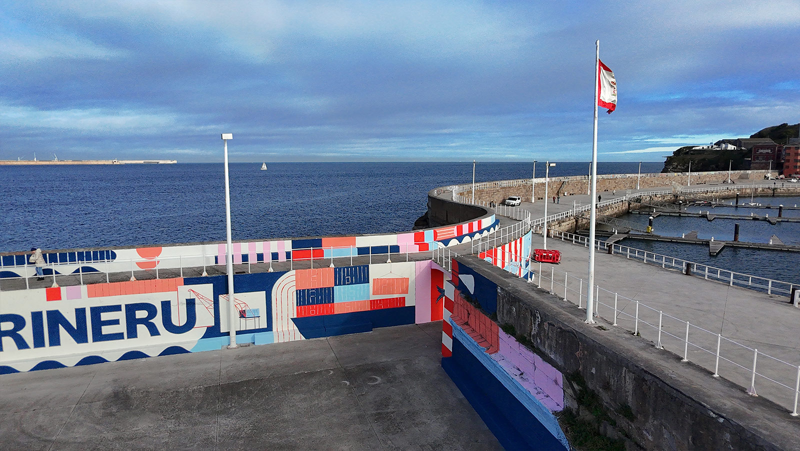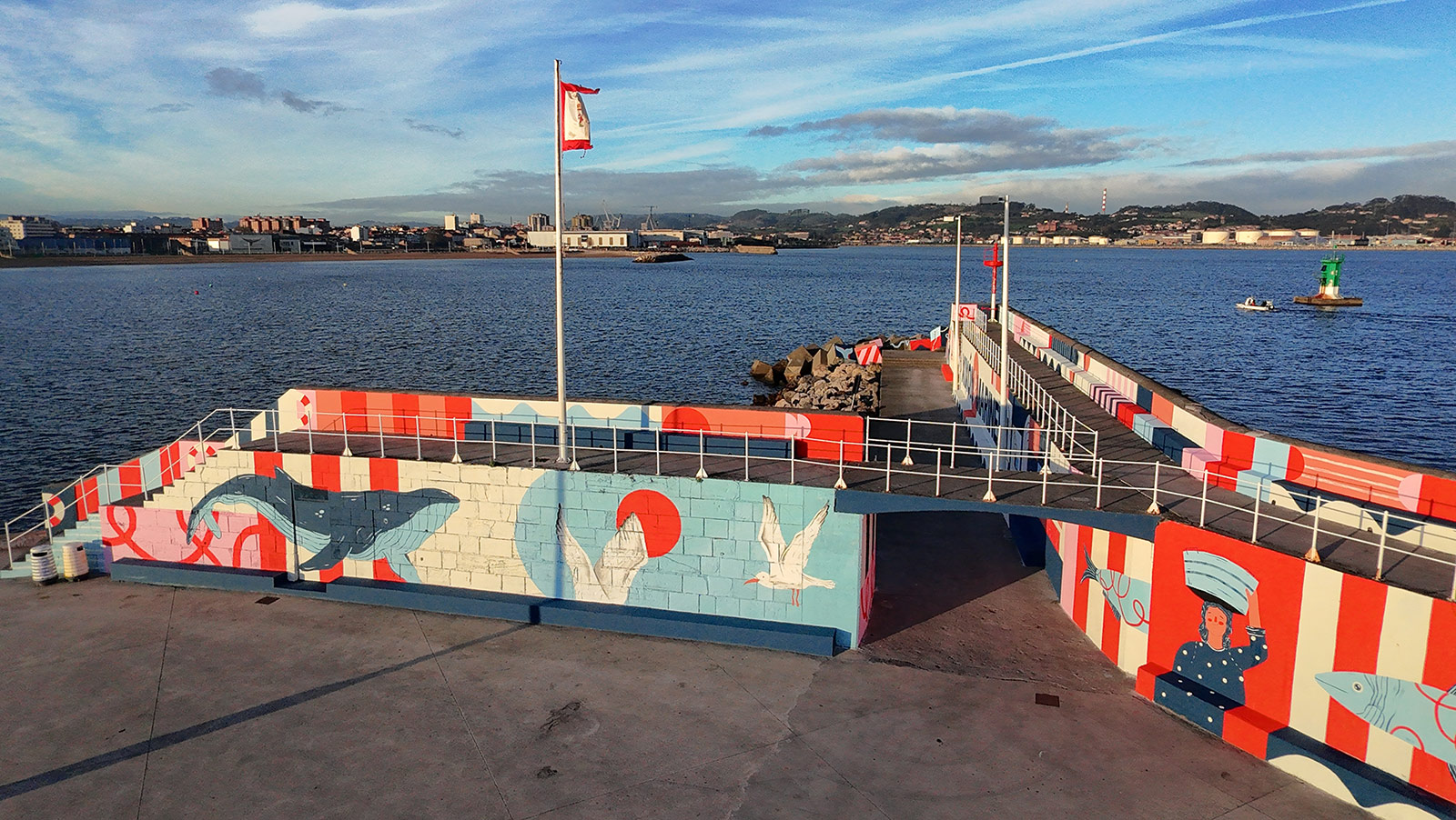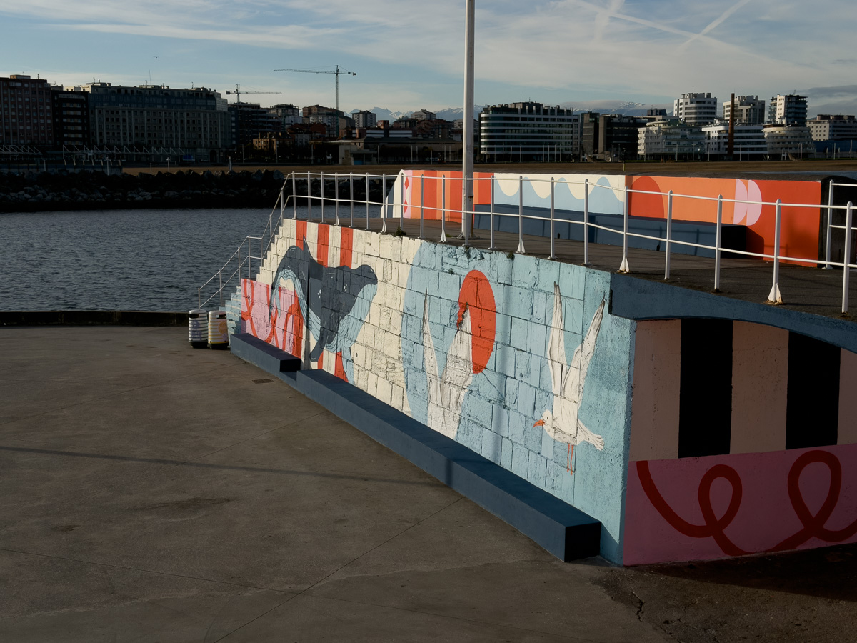 La escala del enclave y su visibilidad desde numerosos puntos de la ciudad nos llevó a trabajar con piezas de gran tamaño y una gama cromática limitada, capaz de unificar todo el espacio y mantener un vínculo claro con el mar y con el carácter gijonés. Nuestra intención era que cualquier persona que pasara por allí pudiera encontrar algo propio en el mural, algún guiño, alguna historia que le resultara familiar.