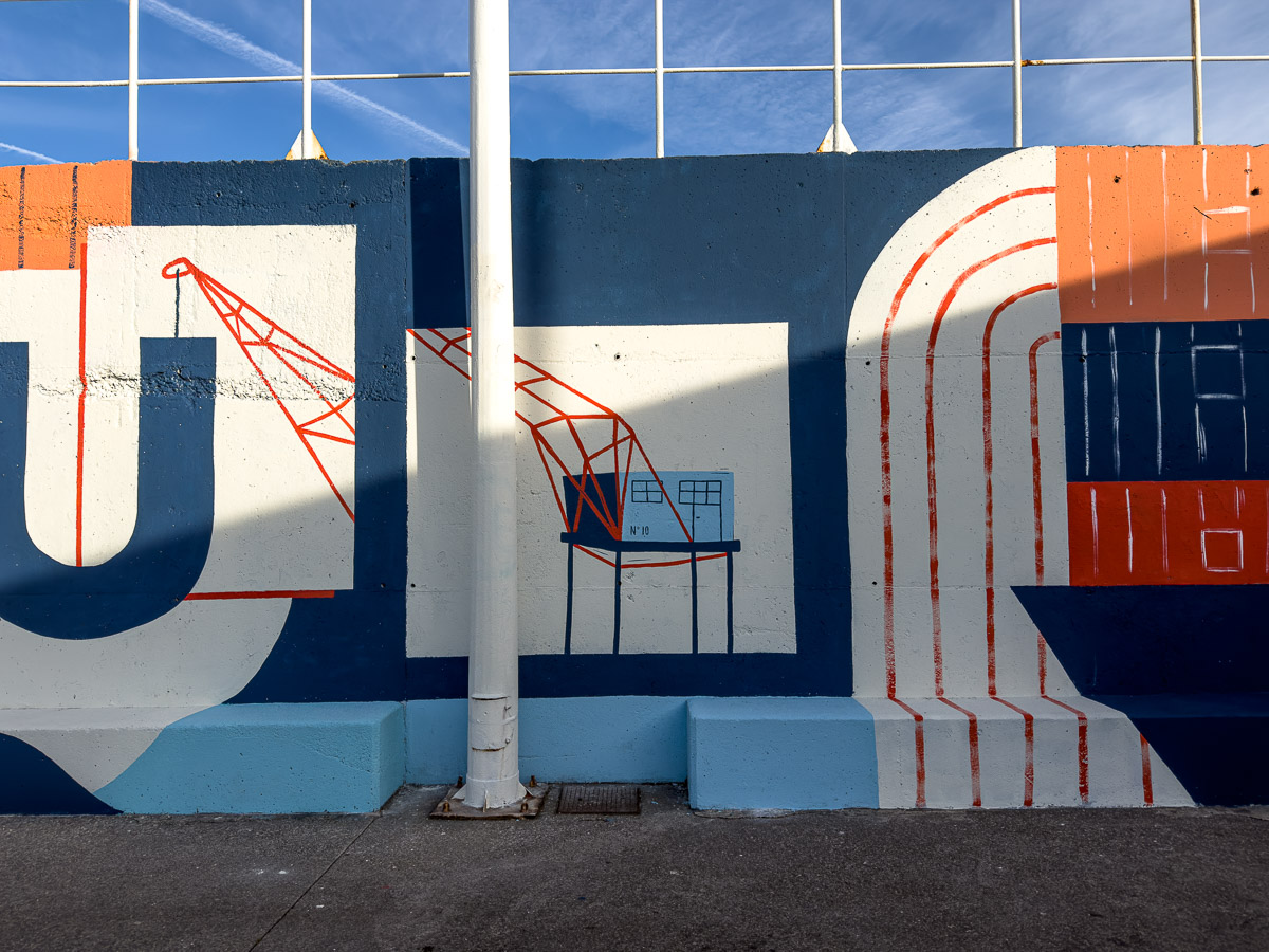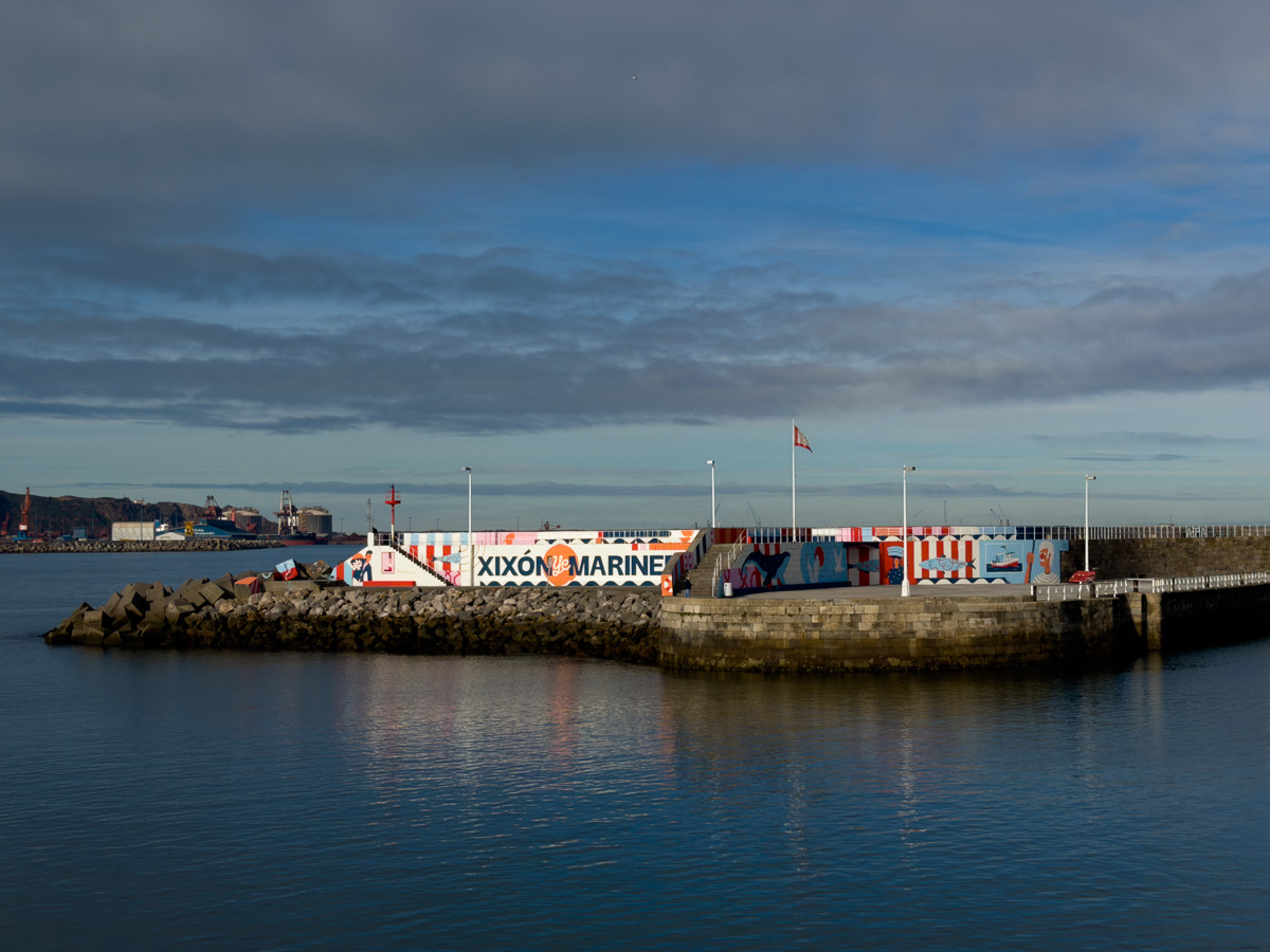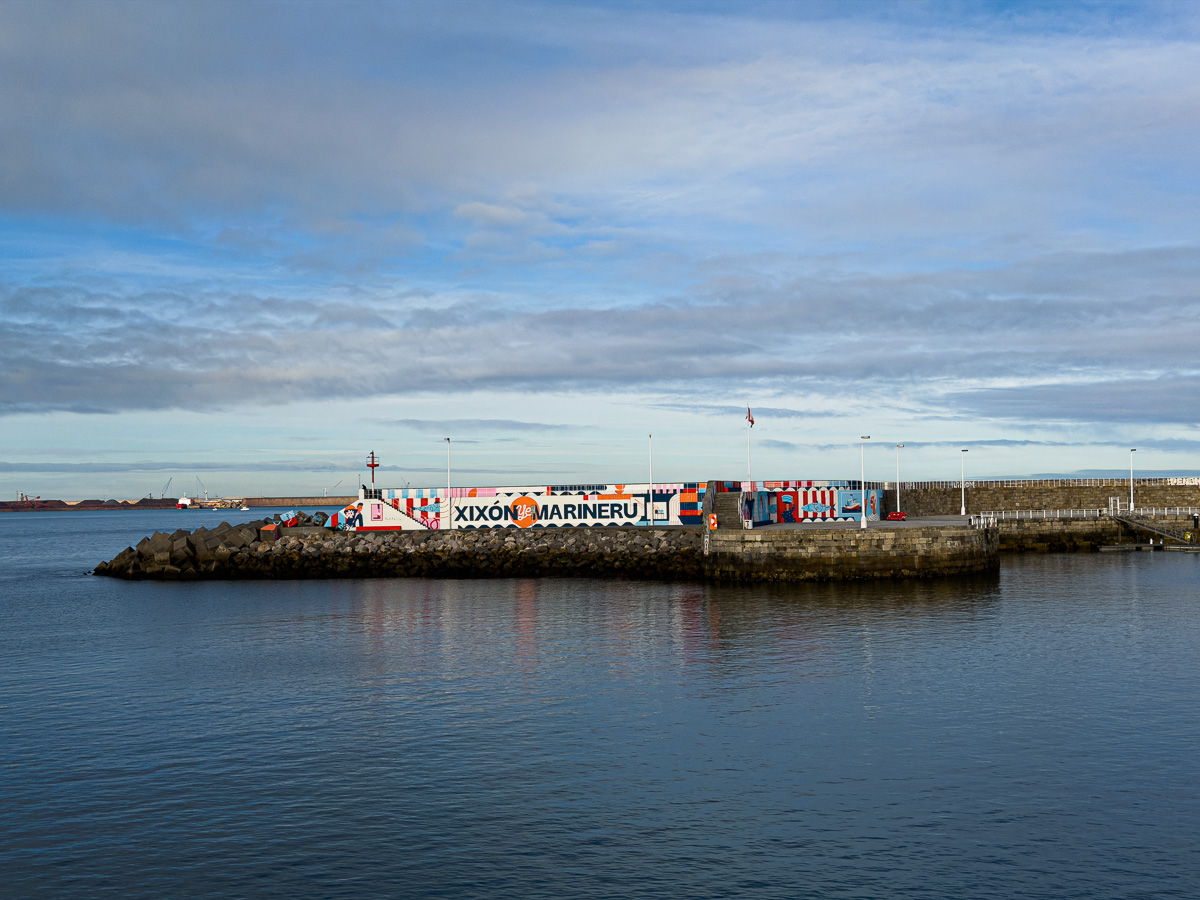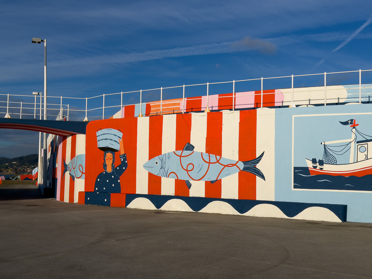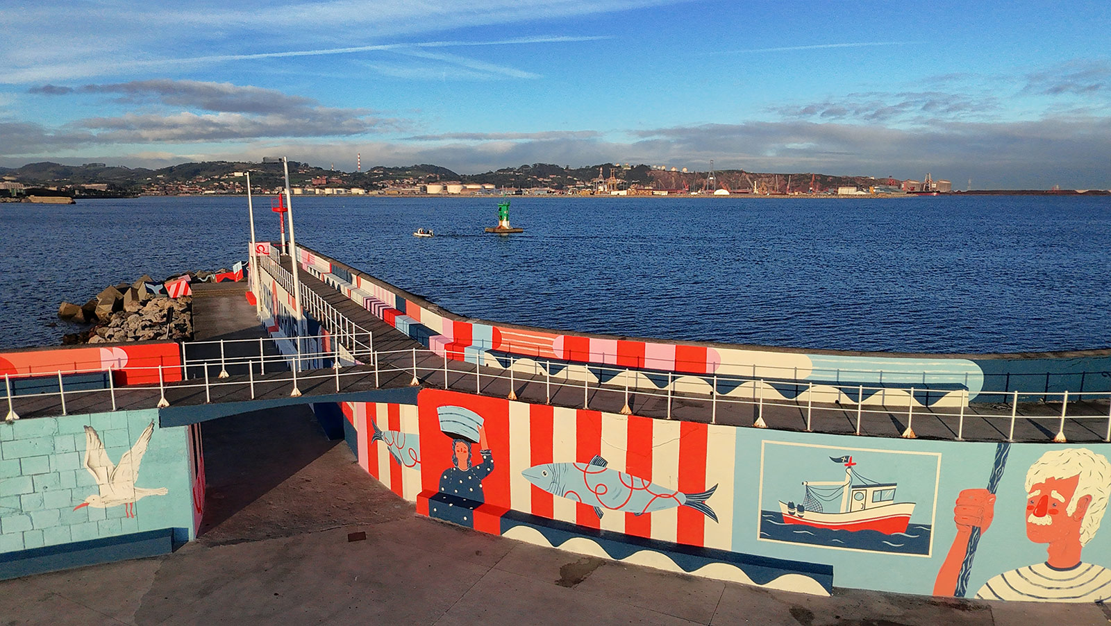 La escala del enclave y su visibilidad desde numerosos puntos de la ciudad nos llevó a trabajar con piezas de gran tamaño y una gama cromática limitada, capaz de unificar todo el espacio y mantener un vínculo claro con el mar y con el carácter gijonés. Nuestra intención era que cualquier persona que pasara por allí pudiera encontrar algo propio en el mural, algún guiño, alguna historia que le resultara familiar.