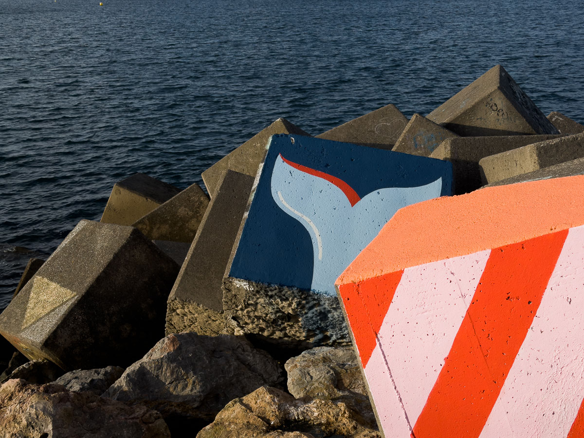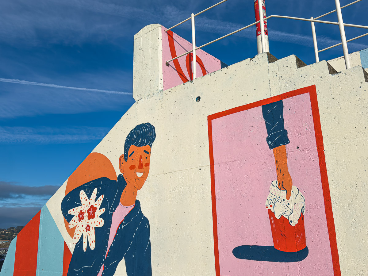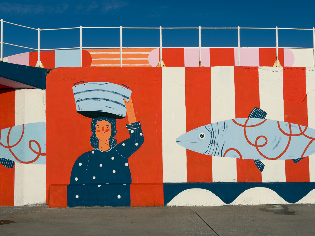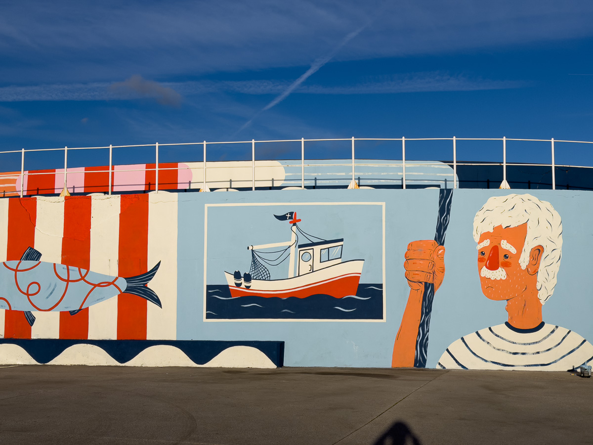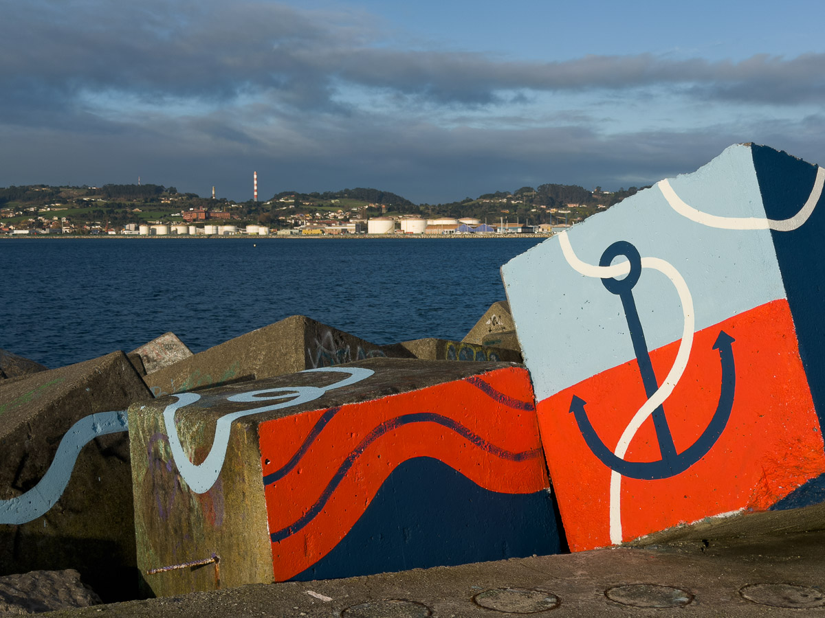 La escala del enclave y su visibilidad desde numerosos puntos de la ciudad nos llevó a trabajar con piezas de gran tamaño y una gama cromática limitada, capaz de unificar todo el espacio y mantener un vínculo claro con el mar y con el carácter gijonés. Nuestra intención era que cualquier persona que pasara por allí pudiera encontrar algo propio en el mural, algún guiño, alguna historia que le resultara familiar.