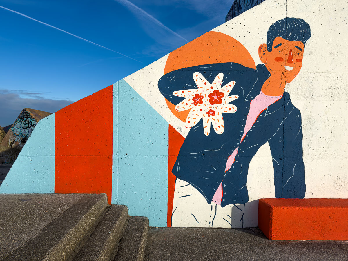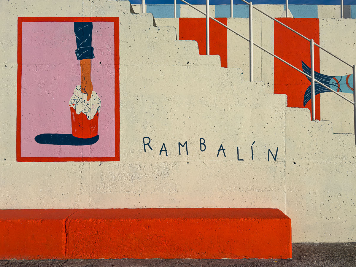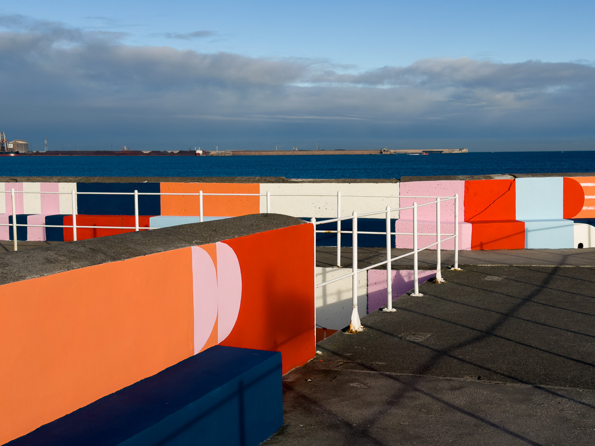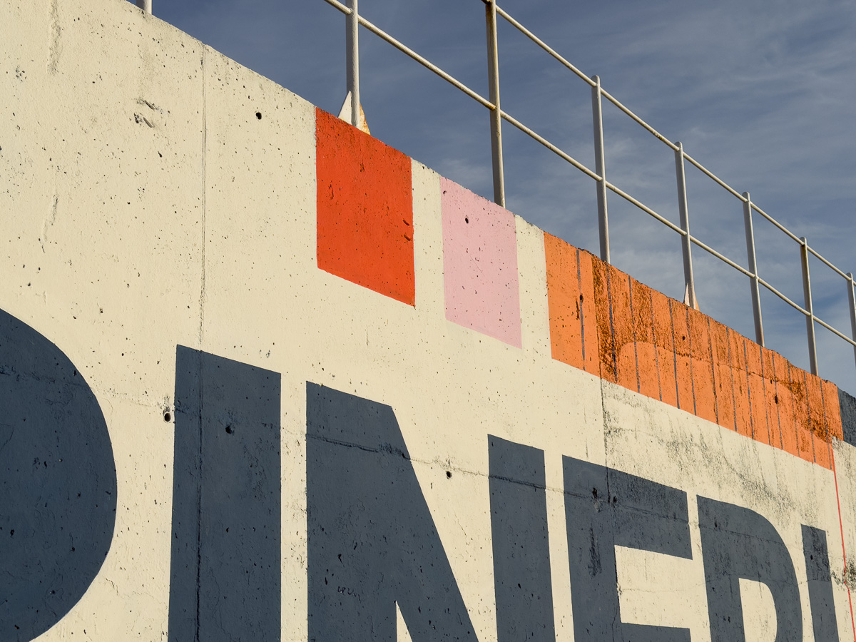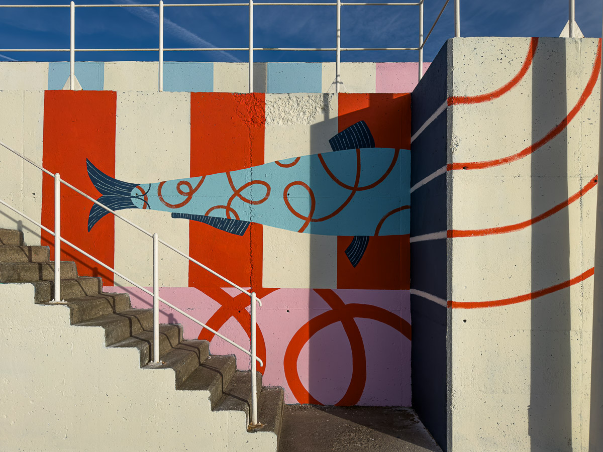 La escala del enclave y su visibilidad desde numerosos puntos de la ciudad nos llevó a trabajar con piezas de gran tamaño y una gama cromática limitada, capaz de unificar todo el espacio y mantener un vínculo claro con el mar y con el carácter gijonés. Nuestra intención era que cualquier persona que pasara por allí pudiera encontrar algo propio en el mural, algún guiño, alguna historia que le resultara familiar.