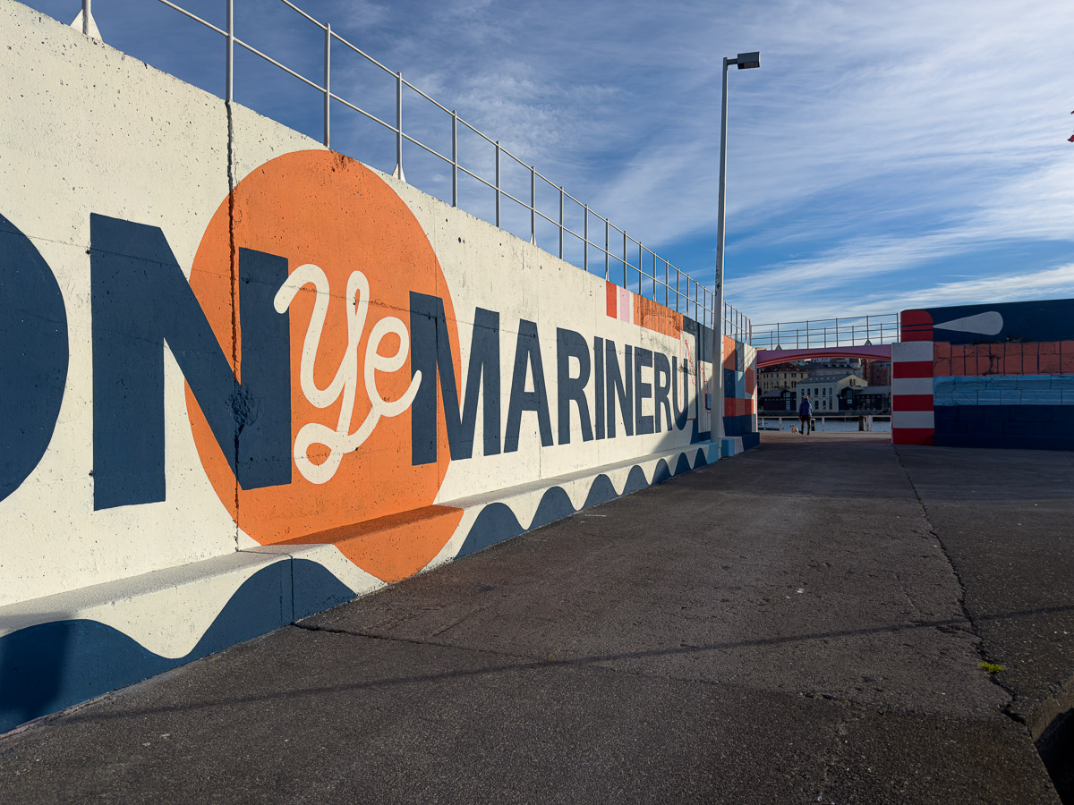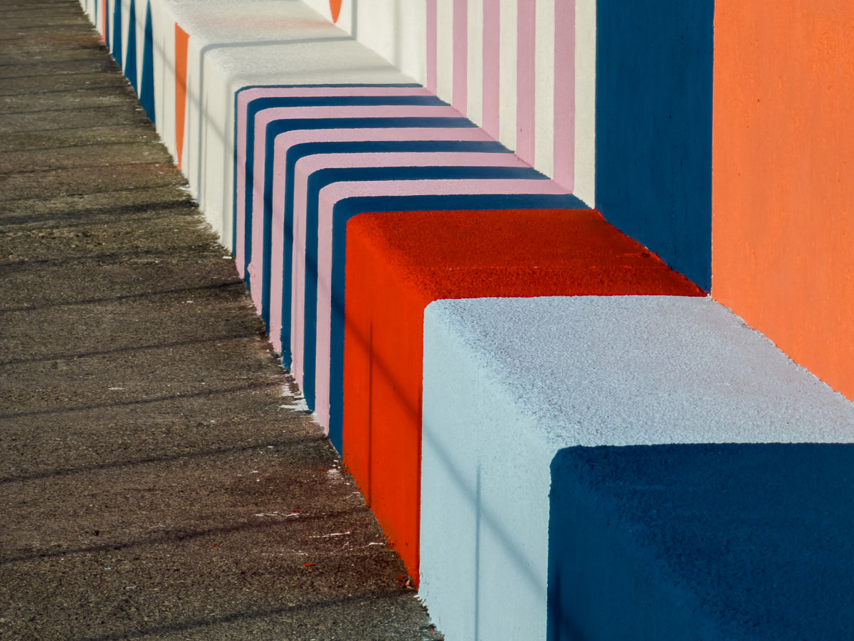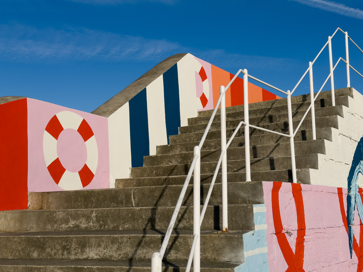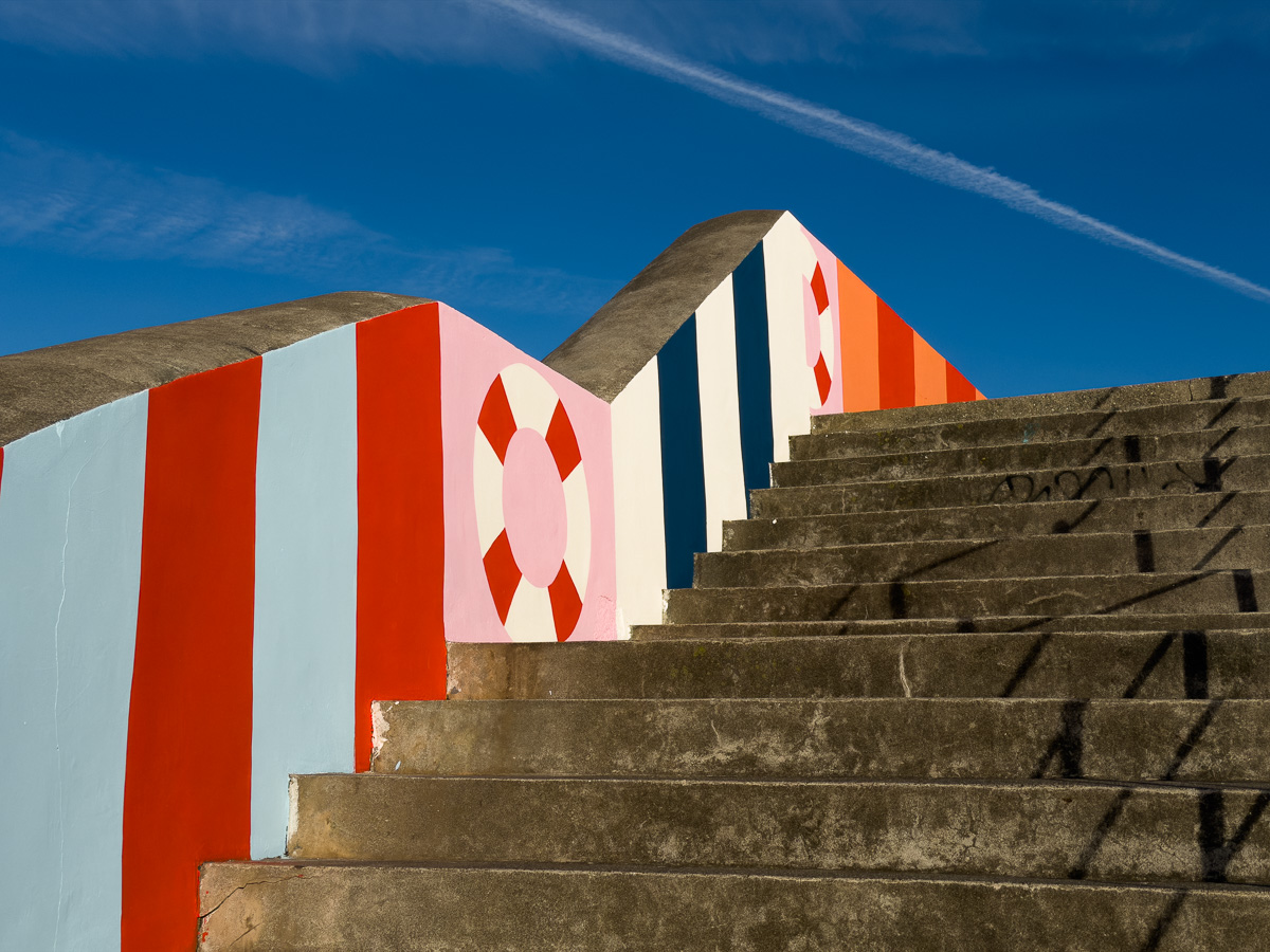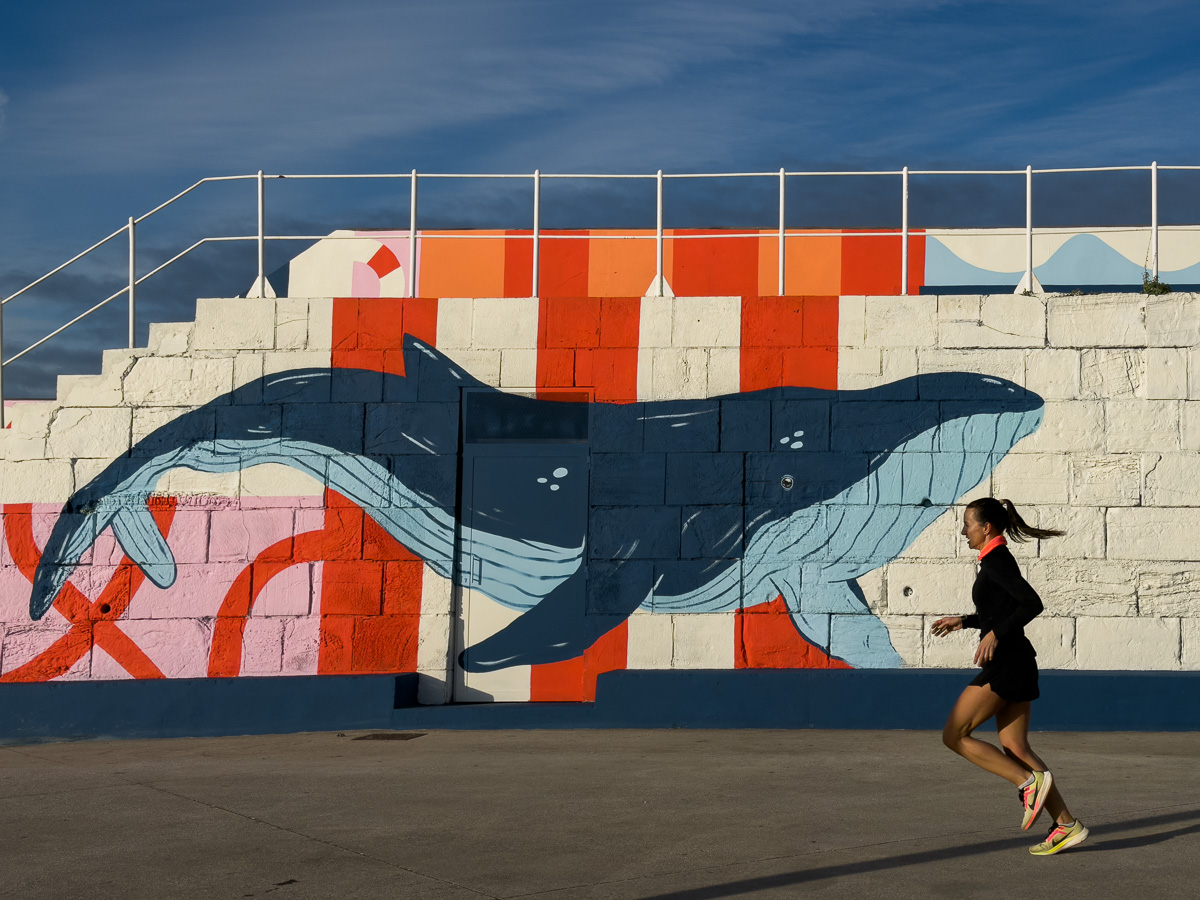 La escala del enclave y su visibilidad desde numerosos puntos de la ciudad nos llevó a trabajar con piezas de gran tamaño y una gama cromática limitada, capaz de unificar todo el espacio y mantener un vínculo claro con el mar y con el carácter gijonés. Nuestra intención era que cualquier persona que pasara por allí pudiera encontrar algo propio en el mural, algún guiño, alguna historia que le resultara familiar.